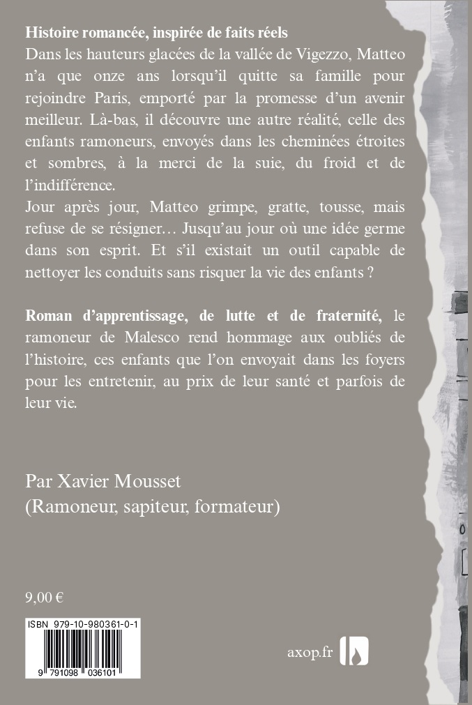J’ai fait paraître ce petit roman en hommage aux petits ramoneurs du XIXᵉ siècle, venus d’Italie, de Savoie ou d’ailleurs, qui ont quitté leur famille pour rejoindre les cheminées de Paris.